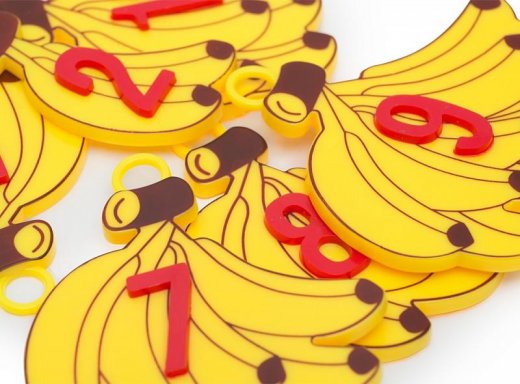 В состав игры входят фигурка обезьянки на подставке, фишки-бананы с числами от 1 до 10: по 2 фишки с числами от 1 до 5 и по 1 фишке с числами от 6 до 10.