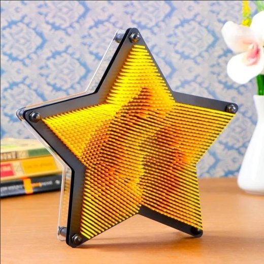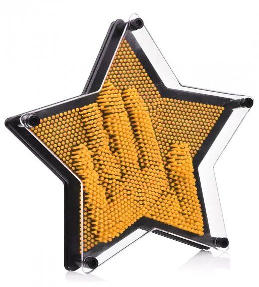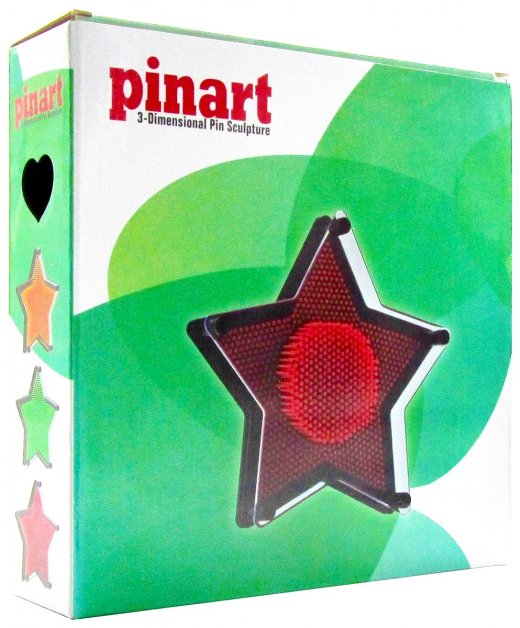 Экспресс скульптор Pinart Звезда - это прибор, представляющий собой пластину-основание, на которой закреплены пластмассовые стержни (гвоздики), закрытые прозрачной передней панелью. Чтобы создать слепок, опустите устройство горизонтально-прозрачной поверхностью вверх - так все стерженьки должны упасть. Затем расположите экспресс-скульптор вертикально и приложите ладонь или какой-нибудь предмет к ровной поверхности гвоздиков. Ваше творение готово! Объёмный отпечаток получается точным до мелочей.