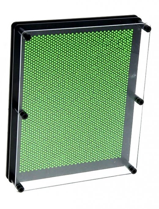 Экспресс скульптор "PinART", 5.8х20х25 см— прибор, представляющий собой пластину-основание, на которой закреплены несколько сотен металлических стерженьков-гвоздиков, закрытых прозрачной передней панелью. Чтобы создать слепок, опустите устройство горизонтально прозрачной поверхностью вверх — так все стерженьки должны упасть. Затем расположите экспресс-скульптор вертикально и приложите ладонь или какой-нибудь предмет к ровной поверхности гвоздиков. Ваше творение готово! Объёмный отпечаток получается точным до мелочей.