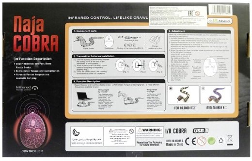 Состав набора: игрушка, пульт, usb-кабель (для зарядки кобры), батарейки (для пульта), инструкция.