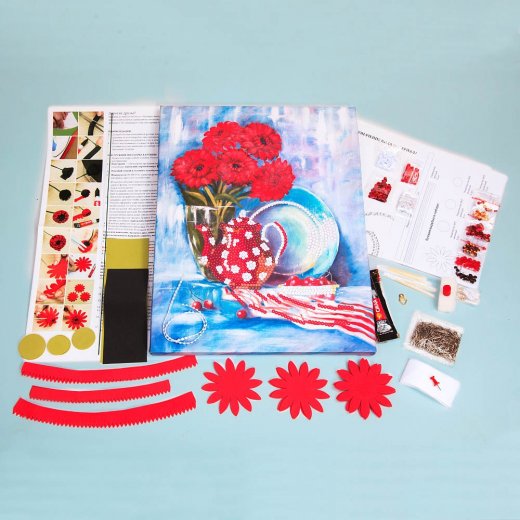Состав набора: холст с напечатанной схемой, натянутый на подрамник, пайетки, готовая вырубка цветов из фоамирана, тесьма с полубусинами, клей, лента респовая, пастель, проволока, зубочистки, выкройка, гвоздики-булавки, силовые иглы, крепеж для крепления картины, пошаговая инструкция.