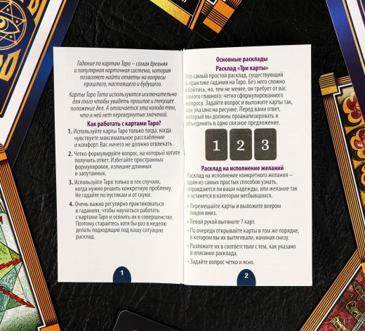 Алистер Кроули — создатель колоды — считал, что гадания доступны каждому, так как все мы обладаем сверхспособностями. Лучший способ открыть в себе внутренние силы — постоянная практика в трактовке раскладов. Карты Таро Тота используются исключительно для того, чтобы увидеть прошлое и текущее положение дел. А отличается эта колода тем, что в ней нет перевёрнутых значений.