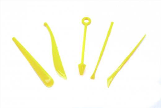 Набор из пяти ножичков-стеков для игры с кинетическим песком и пластилином.