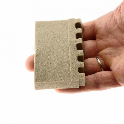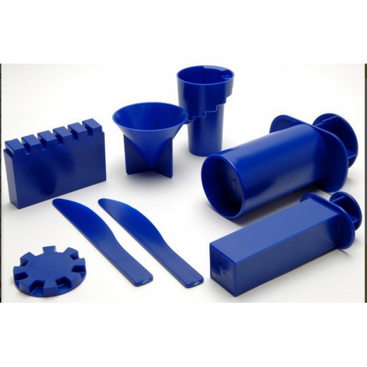 В наборе содержится 8 предметов, которые позволят вам делать большие цилиндрические и прямоугольные кирпичи при помощи специальных шприцов. Сделайте один большой брусок и разрежьте его на несколько поменьше при помощи достаточного острого, но безопасного ножа. Таким образом у вас будет много кирпичиков для строительства большой стены замка или стены. В наборе есть специальные формы для создания винтовой лестницы, крыш башен, а также форма для строительства стен с зубчатыми краями.