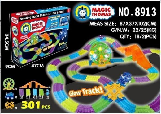 Гоночная трасса Magic Track Томас – это большая гибкая гоночная трасса, которую нужно собрать самостоятельно! Паровозик идет в комплекте! Ваш малыш сможет самостоятельно собирать треки, по которым будет ездить паровозик, а все детали из набора состыкуются с другими треками серии Magic Tracks. Magic Tracks является совершенно новым и необычным светящимся гоночным треком. Такого изгиба гоночной трассы и необыкновенного свечения в темноте Вы никогда не видели! Вы можете изогнуть трассу на 360? Просто соедините кусочки трека вместе, и вы получаете полностью настроенную трассу своего собственного творения.