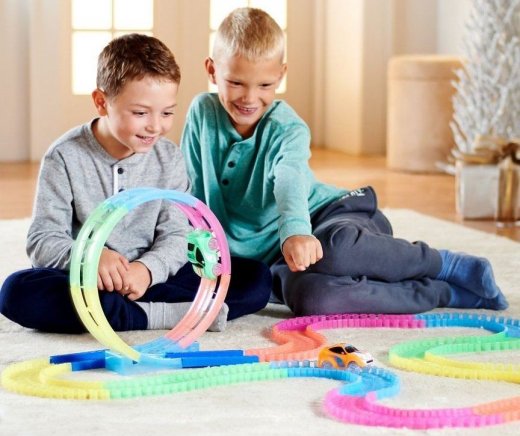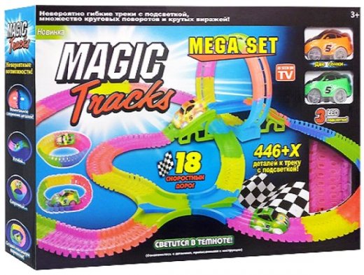 Magic Tracks – это большая гибкая гоночная трасса, которую нужно собрать самостоятельно! Два светящихся скоростных автомобиля в комплекте! Ваш малыш сможет самостоятельно собирать треки, по которым будут ездить машинки, а все детали из набора состыкуются с другими треками серии Magic Tracks. Magic Tracks является совершенно новым и необычным светящимся гоночным треком. Такого изгиба гоночной трассы и необыкновенного свечения в темноте Вы никогда не видели! Вы можете изогнуть трассу на 360? Просто соедините кусочки трека вместе, и вы получаете полностью настроенную трассу своего собственного творения. А еще лучше, когда вы выключаете свет и погружаетесь в магию Magic Tracks!