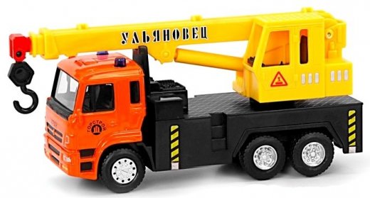 Игрушка оснащена инерционным механизмом, работающим по принципу потяни — отпусти, платформа крана может разворачиваться вокруг своей оси, стрела телескопическая — выдвигается, поднимается и опускается. Такой представитель строительной техники найдет себе достойное место на полочке у коллекционера и не подведет малыша на прогулке — играть будет весело!