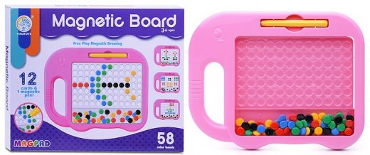 Игра «Магнитное рисование» поможет обучить ребёнка письму в дошкольном возрасте. В комплект входит планшет с разноцветными пуговками и ручка-магнит. Перемещать элементы легко – они сами слушаются палочку с намагниченным наконечником и перелетают в круглые прозрачные ячейки. Малышу не нужно прикасаться к ним руками – чтобы пуговка следовала за стилусом проведите им по понели перемещая в одно из отверстий.