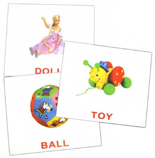 Комплект карточек "Первые английские слова" – 20 карточек с фотографиями самых известных предметов, окружающих малыша, с подписями на английском языке, сделанными шрифтами большого размера.