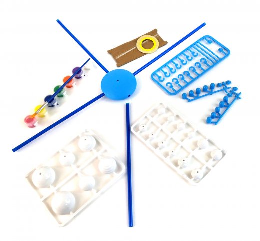 Состав набора: кронштейн, крючки 14 шт, леска, заглушки 5 шт, трубочки 4 шт, подвеска, Кольцо Сатурна, панель с красками пластмассовая, светящаяся краска, кисточка, диаграмма.