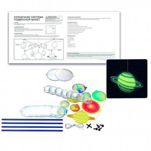 Состав набора: набор планет солнечной системы, напечатанный на картоне светящимися чернилами, набор для сборки прозрачного купола (18 деталей), набор подвесных компонентов, включая соединения, пластиковые трубки и нить, подробная инструкция, вопросы и ответы викторины