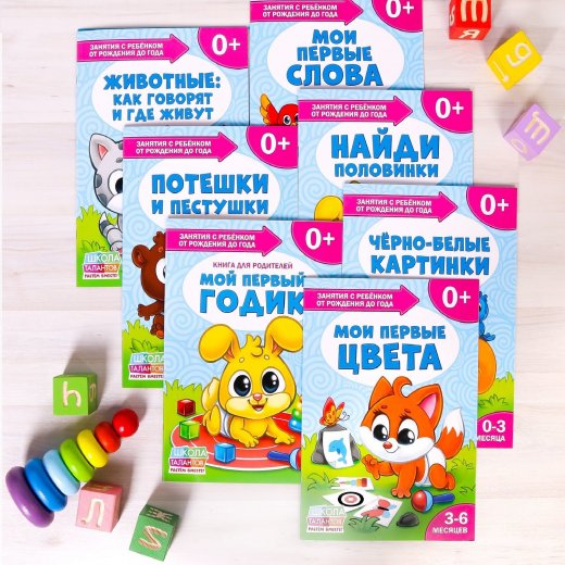 Эти красочные издания, с любовью разработанные для самых маленьких, помогут крохе развиваться на первом году жизни. "Чёрно-белые картинки" и "Мои первые цвета" будут тренировать зрение крохи. "Животные: как говорят и где живут", "Мои первые слова" и "Потешки и пестушки" поспособствуют формированию речи и первым шагам в знакомстве карапуза с окружающим миром. "Найди половинки" улучшит умственные способности. А в кратком методическом пособии "Мой первый годик" родители найдут информацию о развитии малыша.