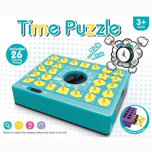Цель игры Time Puzzle - как можно быстрее расставить фигуры на игровом поле.В этой игре могут участвовать и дети, и родители. Сложите все пазлы в нужные окошечки на игровом поле за короткое время.Как играть одному?- Положите игровое поле на твёрдую ровную поверхность, чтобы игрок до него дотянулся. Из нижней части игрового поля достаньте все пазлы и разложите их рядом с полем.- Выберите время, за которое ребёнок разложит все пазлы, и запустите таймер.- Попросите ребёнка вставить каждую деталь в соответствующее ей окошечко на игровом поле.- По окончании времени все пазлы выпрыгнут из окошечек.- Игрок должен успеть разложить все!