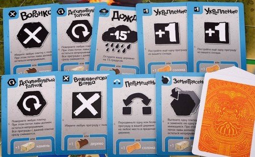 Чтобы сдержать потоки лавы, игроки могут строить ограждения (соломенное, деревянное или каменное). В свой ход игроки также могут разыгрывать карты действий, способные поменять игровую ситуацию. Дополнительный толчок позволит повернуть на поле любую плитку лавы, Землетрясение дает возможность заменить любую плитку лавы на новую, а с помощью Воронки можно и вовсе удалить с поля одну из плиток лавы. Всего в игре 8 типов карт действий с уникальными возможностями. Вместо розыгрыша карт действий их можно использовать для обмена и получения дополнительных фишек ограждений или плиток лавы.