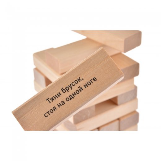Игроки по очереди вытаскивают по одному брусочку и ставят на самый верх башни, но, как вы догадываетесь, это не было бы так просто. Дело в том, что на каждом бруске написано весёлое задание, которое обязательно нужно будет выполнить.