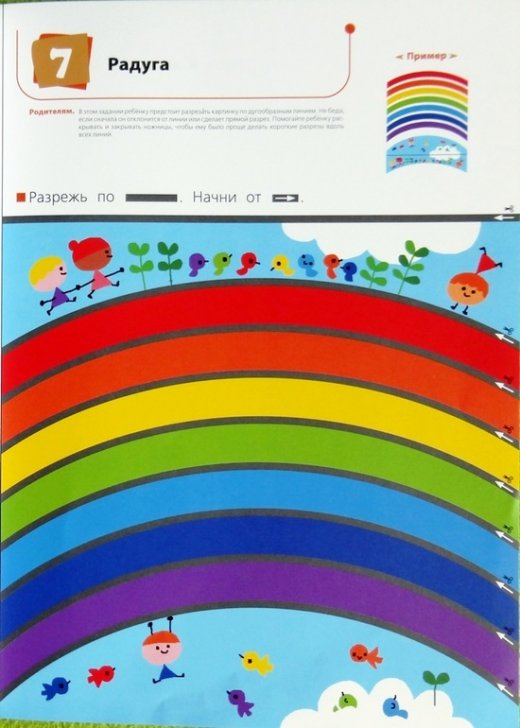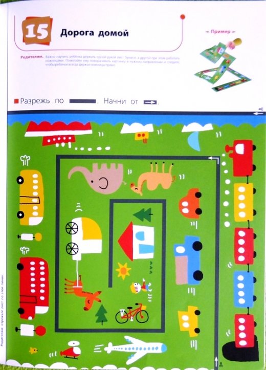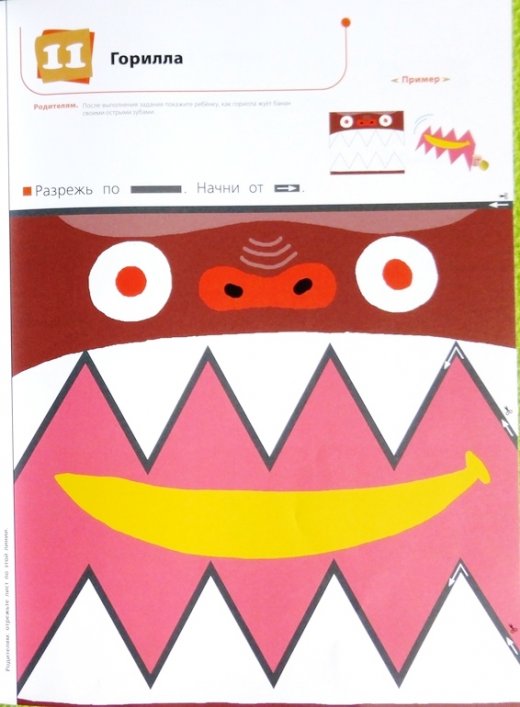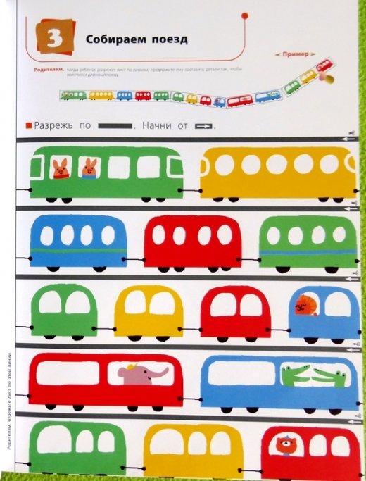 А в самом начале взрослому необходимо подобрать ножницы с закруглёнными концами, подходящие ребёнку по размеру. Показать ребёнку, сверившись с фотографиями в книге, как правильно держать ножницы и делать ими короткие разрезы. Определить, сколько упражнений в день будет делать ребёнок. Например, одно или два упражнения. После выполнения задания похвалить ребёнка. В качестве особой награды написать на листе слова "молодец", "отлично" или приклеить наклейку.
