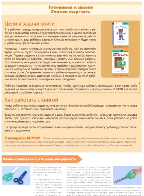Все пособия KUMON используют принцип "от простого к сложному". Так, в этой тетради ребёнку сначала предстоит научиться правильно держать ножницы и делать ими прямые разрезы. С каждым новым упражнением длина разрезов будет увеличиваться, а навыки ребёнка совершенствоваться, что позволит ему перейти к разрезанию картинок по изогнутым и ломаным линиям, а также вырезать фигуры более сложных форм. Постепенно пальчики ребёнка окрепнут, и он сможет хорошо контролировать движения ножниц.
