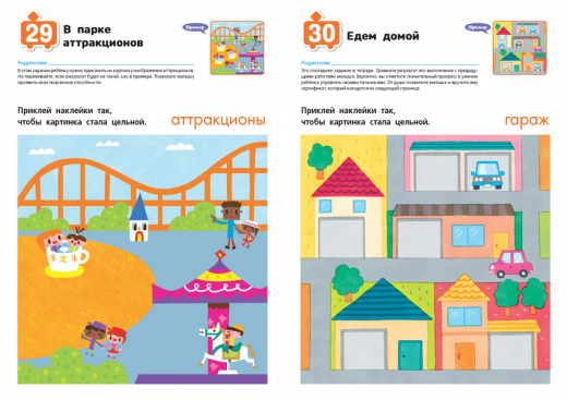 Все пособия KUMON используют принцип "от простого к сложному". Так, в этой тетради ребёнку предстоит сначала приклеивать наклейки в произвольном порядке. Потом - закрывать на картинке белую область простой геометрической формы однотонной наклейкой. Затем на наклейке появляется рисунок, который нужно совместить с рисунком на картинке. Форма наклеек становится более сложной. Чтобы приклеить наклейки в заключительных заданиях, ребёнок должен проявить фантазию и использовать логику. В них же вы увидите, насколько ловко ребёнок научился манипулировать мелкими деталями.