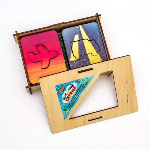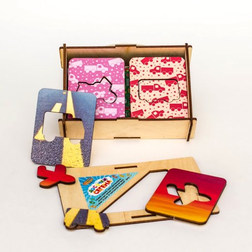 Состав набора: деревянный ящик для хранения, 18 рамок, 18 фигур – вкладышей
