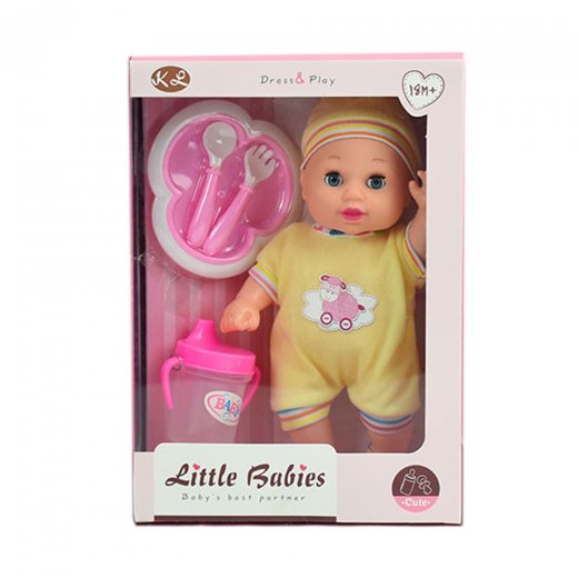 Кукла-младенец "Малыш с тарелочкой" издаёт множество забавных звуков. Также в наборе есть аксессуары для кормления: тарелка, ложечка с вилкой и бутылочка.