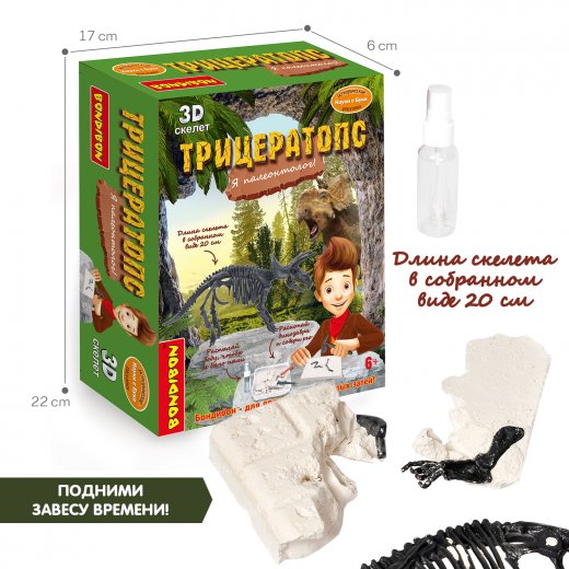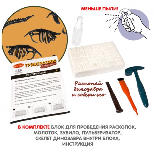 В комплекте: блок для проведения раскопок, молоток, зубило, пузырек с пульверизатором, скелет трицератопса внутри гипсового блока, иллюстрированная инструкция.