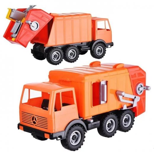 Игрушечный мусоровоз "Мерседес" стилизован под знакомый каждому жителю городов трехосный мусоровоз от компании Mercedes Benz. Яркие цвета, использованные в дизайне машинки, непременно могут привлечь внимание ребенка. А набор из дополнительных мусорных баков сделает сюжетно-ролевые игры с использованием этой машинки ещё более реалистичными. Мусорные баки можно выгружать в кузов мусоровоза с помощью специальных подъемников. В кузове машинки так же имеется боковое окошко, открыв которое можно увидеть содержимое мусоровоза.