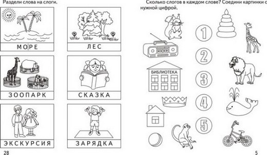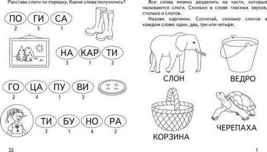 Занятия по этой тетради помогут малышу овладеть навыком деления слов на слоги, определять количество слогов в слове. Малыш научится различать гласные и согласные буквы и определять их место в словах, а также научится подбирать слова с одинаковым количеством слогов. Возможно, Вам придется помочь малышу, задав ему наводящие вопросы. Хорошо, если Вы сможете предложить ребенку подобные задания для повторения.