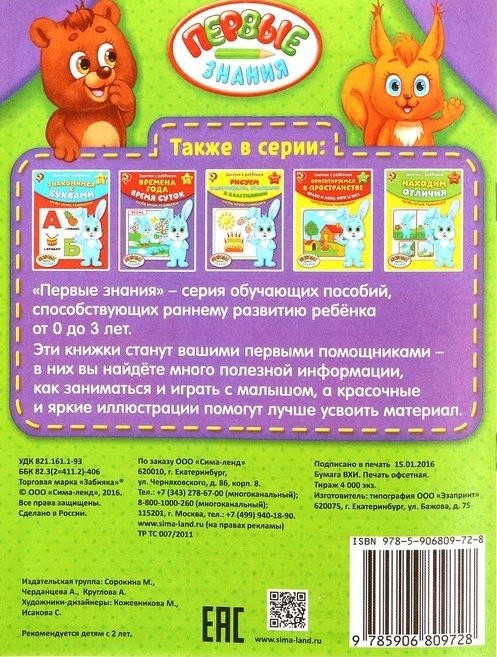 Серия пособий «Первые знания» станет помощником в занятиях с ребёнком! Главная особенность обучающих книг в том, что они будут интересны малышу не только до двух лет, но и после.
