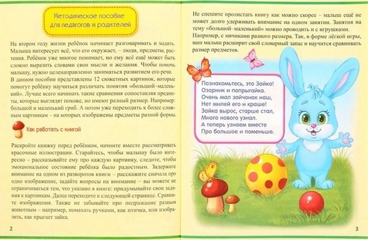 На первых страницах вы найдёте советы, как проводить занятия с малышом. Пособие содержит 12 сюжетных картинок и заданий, которые научат ребёнка различать понятия «большой» и «маленький». Рассматривайте картинки вместе с ребёнком, задавайте ему вопросы и подражайте звукам персонажей.