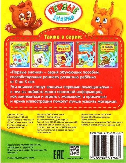 Серия обучающих книг «Первые знания» — это комплексная система занятий с ребёнком. Она делится на три возрастных периода: от 0 до 1 года, от 1 года до 2 лет, от 2 до 3 лет.