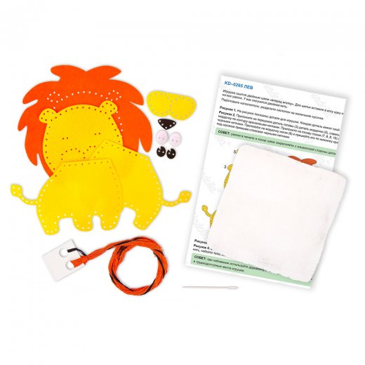 Набор для шитья из фетра Лев 16 х16 см - в набор входят все необходимые материалы для изготовления игрушки: детали из фетра с перфорацией, безопасная пластиковая игла, нитки, синтепон, подробная инструкция с картинками.