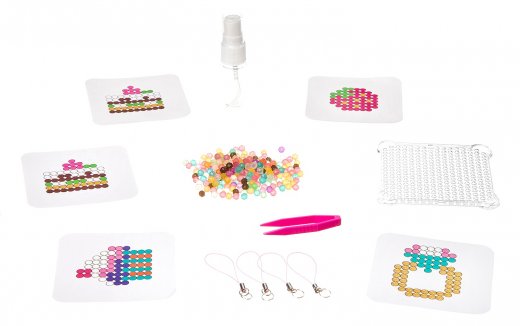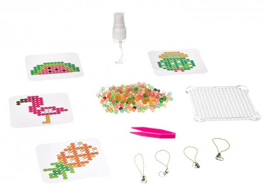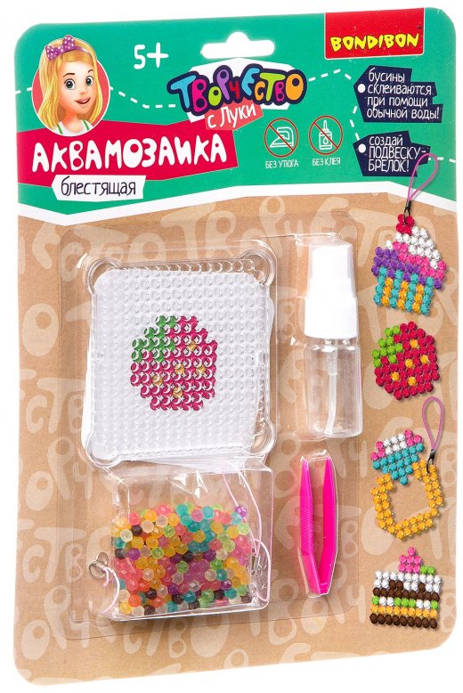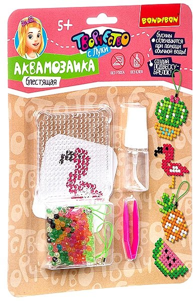 Аквамозаика блестящая Брелоки-подвески Творчество с Луки – это весьма интересный и занимательный подарок для юного любителя мозаик. Аквамозаика под воздействием жидкости превращается в объёмную фигурку, с которой можно играть. Юному любителю творчества необходимо лишь выбрать шаблон, затем выложить бисер по трафарету и смочить полученную фигурку водой. И вуаля – произведение искусства готово! Блестящие бусины, яркие цвета, забавные персонажи, 4 фигуры в каждом наборе. Самые любимые поделки можно носить с собой как брелок.