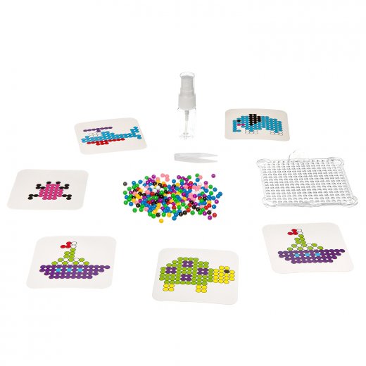Состав набора: набор цветных шариков, пластиковая основа, распылитель воды, карточки-трафареты, пинцет.