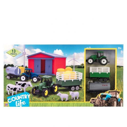 Отличный игровой набор в котором есть все необходимое для любителей загородной жизни. В наборе присутствуют трактор, два прицепа, ангар, животные и другие аксессуары.
