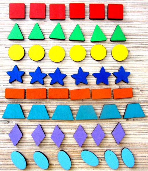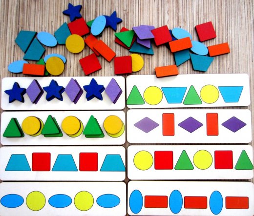 7)Поиграйте в игру «Что изменилось?». Выложите в рад 5-6 фигур. Попросите ребенка закрыть глаза и поменяйте местами несколько фигур. Попросите малыша сказать, что изменилось.