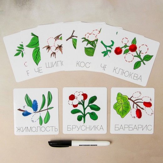 - Обводите картинки и их названия на многоразовых карточках маркером, стирайте с помощью сухой салфетки, вложенной в набор.