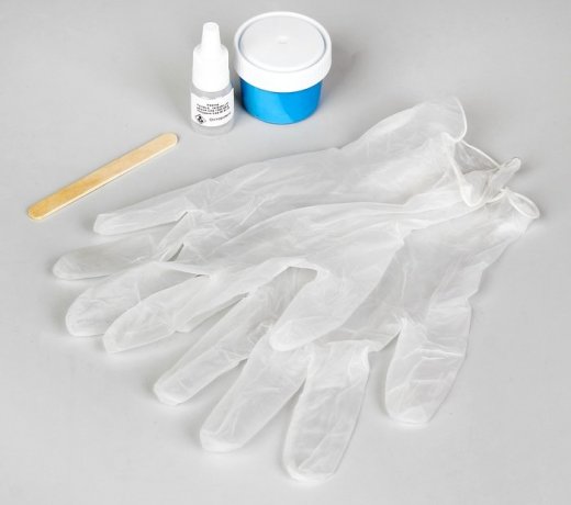 Состав набора: химический реактив, пакет, палочка для размешивания, перчатки, инструкция.