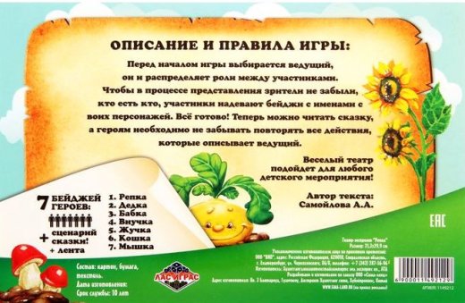Состав набора: 7 бейджей героев, сценарий сказки, лента.
