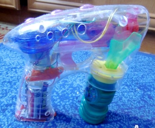 Пистолет с мыльными пузырями – великолепный подарок для юных проказников. Все ребятишки любят играть с мыльными пузырями. Так весело надувать их, а потом бегать и ловить! А ведь такое увлекательное развлечение очень полезно для малышей: надувание пузырей развивает у детишек легкие и дыхательную систему, что особенно полезно для их здоровья. Можно самому приготовить мыльный раствор и пускать пузыри из трубочки, но с помощью специального пистолета, который будет надувать их очень быстро и у вас получится масса искрящихся мыльных шаров. Процесс "стрельбы" сопровождается световыми эффектами, чтобы сделать игру еще веселее.