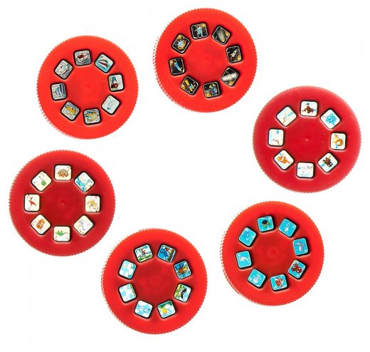 Для того, чтобы установить диск, нужно сдвинуть планку на корпусе (подпружинена). В комплекте 6 дисков, на каждом из которых изображения строго определенной тематики: животные, транспорт, океан, космос, динозавры, птицы. Можно выбрать любые для просмотра.