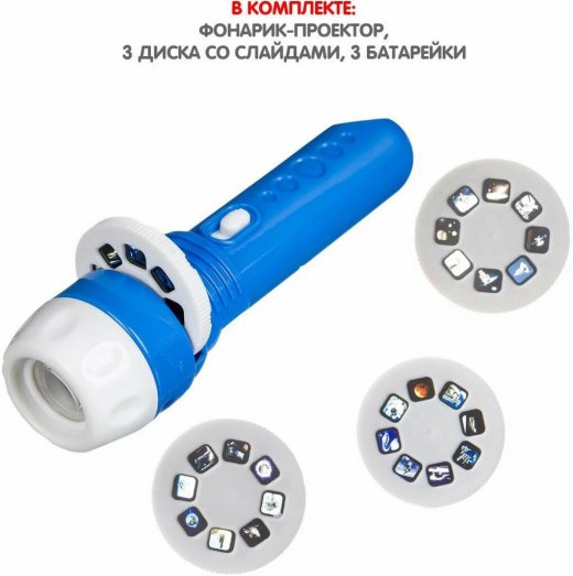 Классическое и не теряющее актуальности развлечение - диапроектор - непременно увлечет и современных детей! Познакомьте ребёнка с удивительным миром космоса! Выберите один из трёх комплектных дисков, вставьте его в фонарик, включите и погрузитесь в глубокий космос. Фонарик работает от трёх батареек AG13 (в комплекте).