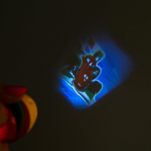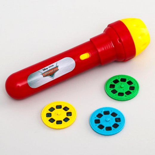 Проектор-фонарик "Тачки" станет новым верным другом ребёнка. Этот мультфонарик является крошечным проектором. К нему прилагается три диска со слайдами, на каждом по 8 иллюстраций к известному мультфильму. Надо вставить диск в прорезь сбоку фонарика и включить его, направив на светлую ровную поверхность. При необходимости следует покрутить верхнюю часть проектора, настраивая резкость. И на стене оживет сказочный эпизод.