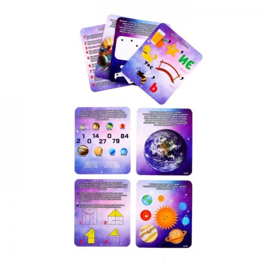 В комплект входит 8 обучающих карточек с заданиями. С ними ребёнок узнает о космосе много интересного, разовьёт мышление, логику и мелкую моторику.