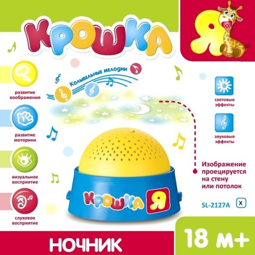 Ночник Крошка я – станет любимой игрушкой для сна, с ним ваш ребенок научится засыпать самостоятельно. Изображение светящегося звездного неба проецируется на стену или потолок, а приятная музыка убаюкивает малыша. Игрушка музыкальная "Крошка Я" со световыми эффектами - это не просто светильник, это яркий, оригинальный ночник - проектор, который создаст уют и подарит радость малышу, а так же поможет развить воображение, слуховое, визуальное, эмоциональное восприятие, мелкую моторику, координацию движений.