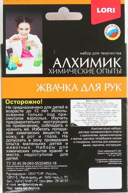 Наборы для опытов "Химические опыты Алхимик" помогут родителям ответить на многие вопросы подрастающего почемучки и провести уникальные химические опыты, наглядно увидев исследуемое явление. Этот набор познакомит с процессом изготовления жвачки для рук. В комплект входит все необходимое для проведения опыта, важно лишь следовать инструкции и соблюдать правила безопасности.