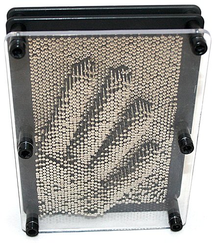 Экспресс скульптор средний - это прибор, представляющий собой пластину-основание, на которой закреплены пластмассовые стержни (гвоздики), закрытые прозрачной передней панелью. Чтобы создать слепок, опустите устройство горизонтально-прозрачной поверхностью вверх - так все стерженьки должны упасть. Затем расположите экспресс-скульптор вертикально и приложите ладонь или какой-нибудь предмет к ровной поверхности гвоздиков. Ваше творение готово! Объёмный отпечаток получается точным до мелочей.