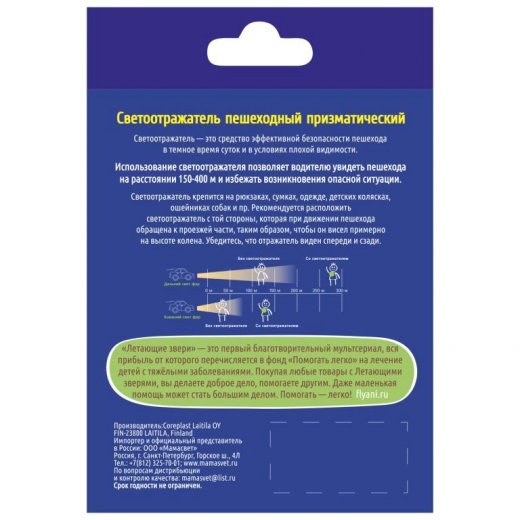 Светоотражатель - это средство эффективной безопасности пешехода в темное время суток и в условиях плохой видимости. Использование светоотражателя позволяет водителю увидеть пешехода на расстоянии 150 - 400 м и избежать возникновения опасной ситуации.