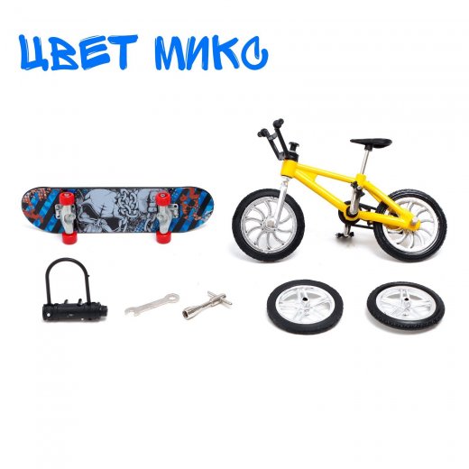 - В комплект входят фингербайк и фингерборд — уменьшенные версии велосипеда и скейтборда.