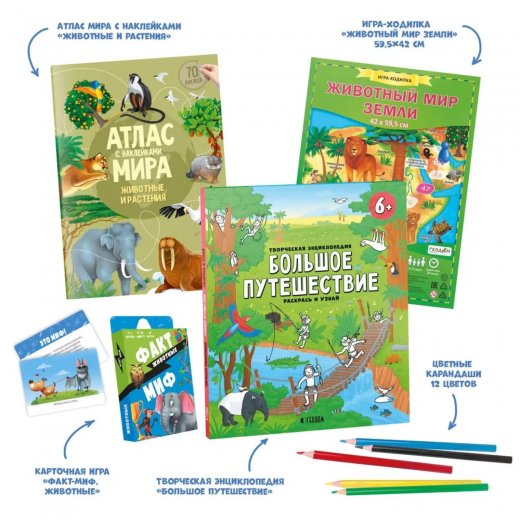 Подарок. Большое путешествие. Мир животных порадует ребенка. Творческая энциклопедия со страничками для раскрашивания, цветные карандаши, две игры и красочный атлас с наклейками.
