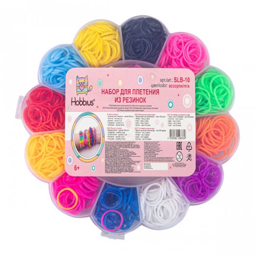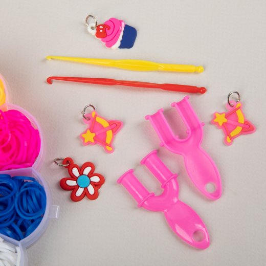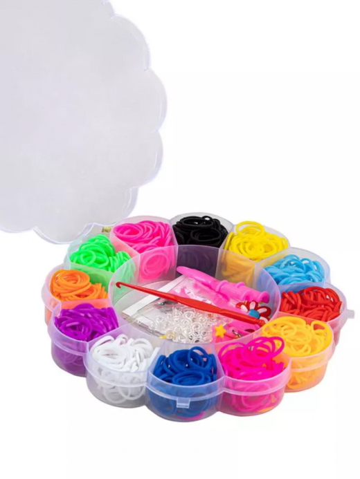 В набор входит: Резинки для плетения - 600 шт. Рогатка - 2 шт. Крючок- 2 шт. Подвеска - 3 шт. Застежки - 24 шт.